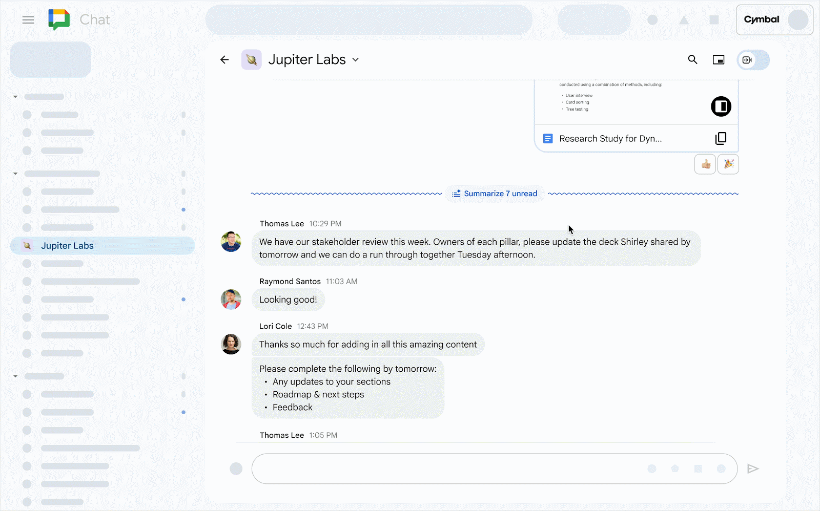 You can currently use Gemini in Google Chat to summarize unread conversations in the Chat home view and to summarize files shared in conversations. To build upon this, we’re adding the ability to catch up on unread messages in a direct message, group conversation, or space.