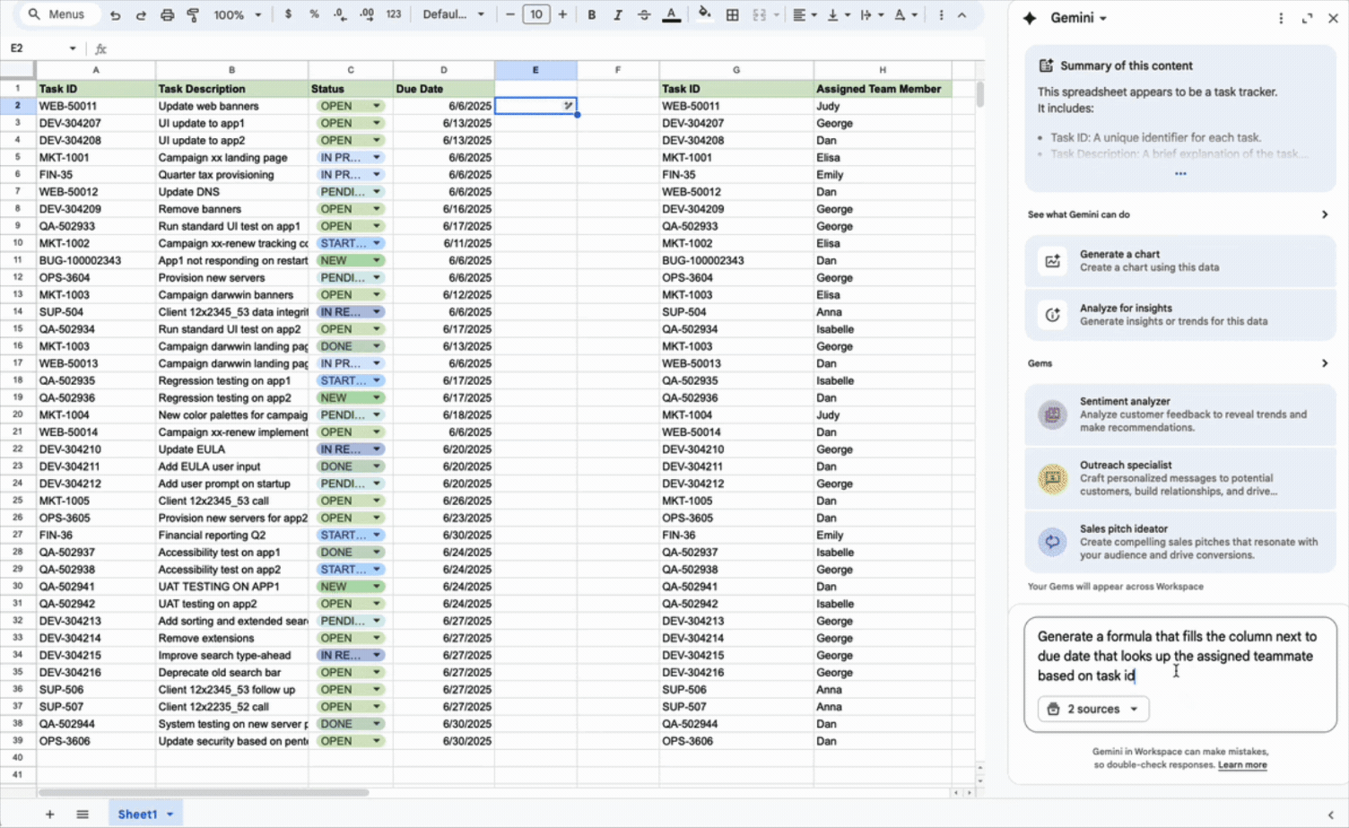 - Generating formulas: Generate complex formulas that reference and perform calculations across several tables in one go. For example, you can now have Gemini write XLOOKUP functions to look up values from one table to use in another, or aggregate data from multiple tables into a single summary calculation.