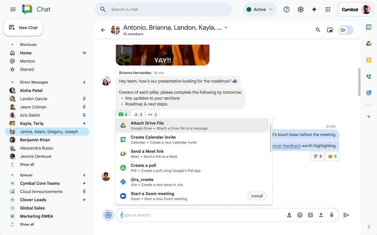 We're making it quicker and easier to find and use your favorite apps and actions in Google Chat with a redesigned integrations menu that lets you search for apps and execute commands with fewer clicks. The menu is accessible through the "+" button next to the compose bar or by typing "/". For example, you can now simply type "/poll" to start a Poll using the Poll app, or press the “+” button and see options to create a calendar invite, upload a Drive file, send a Meet link, or more.