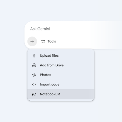 Người dùng cuối: Thêm sổ tay NotebookLM của bạn vào cuộc trò chuyện trong Gemini bằng cách chọn NotebookLM thông qua nút “+” trong hộp thoại nhắc. Người dùng phải được quản trị viên cho phép truy cập NotebookLM để sử dụng tính năng này.